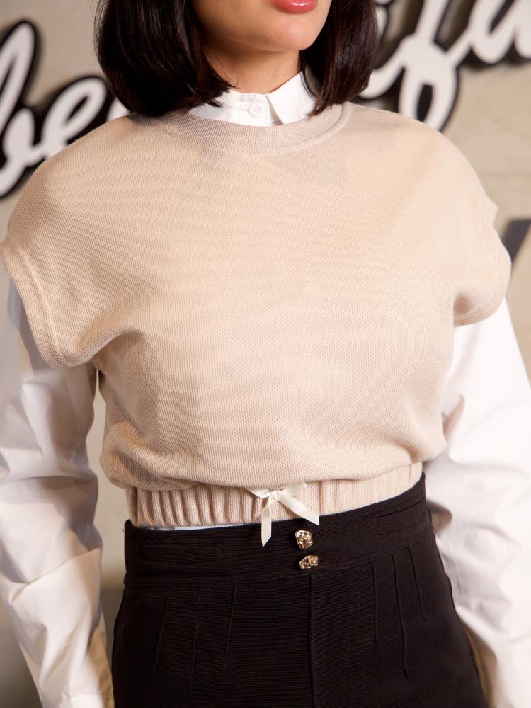 البلوزة بيضاء بأكمام طويلة وقصة رسمية، تتميز بياقة كلاسيكية بأزرار أمامية، ومصممة بطبقة علوية بدون أكمام بلون بيج
