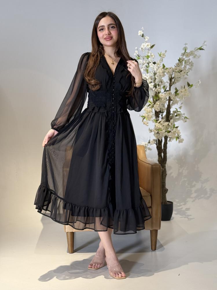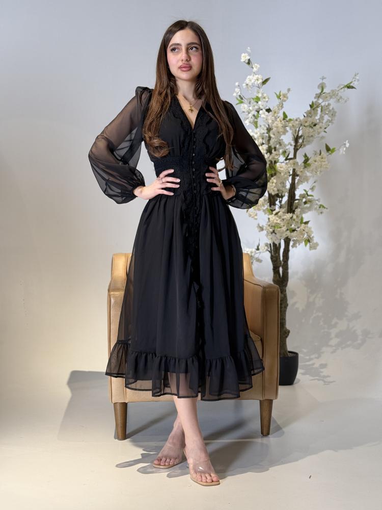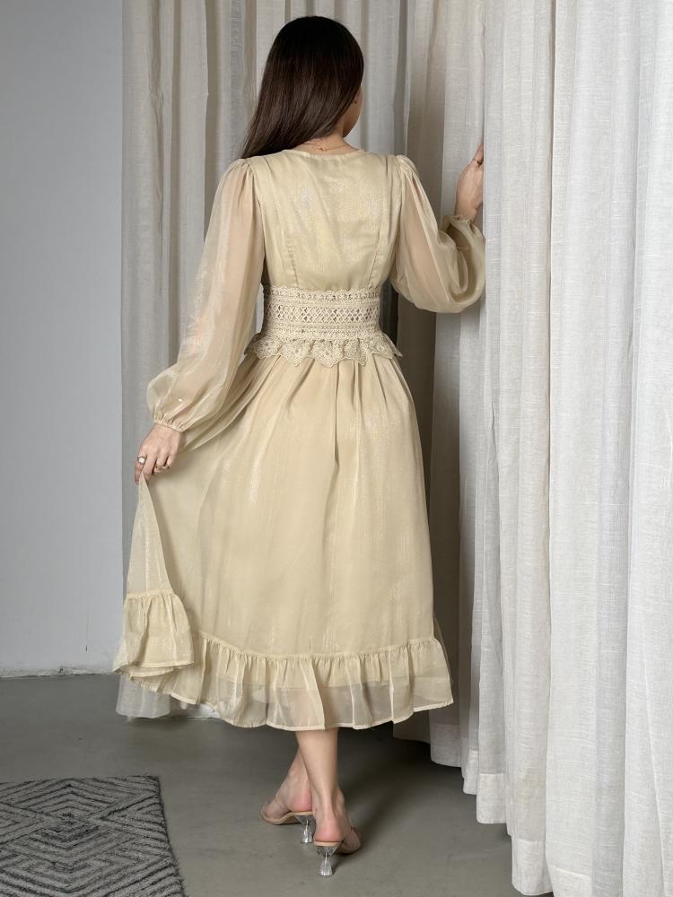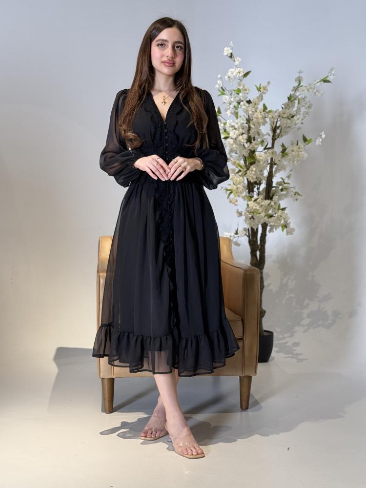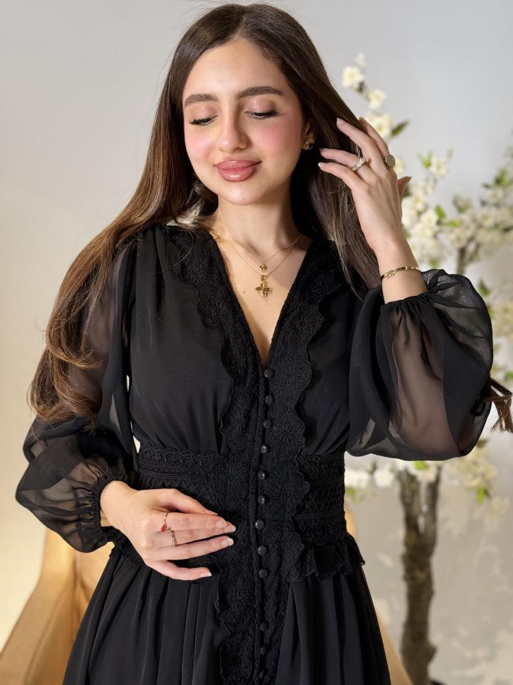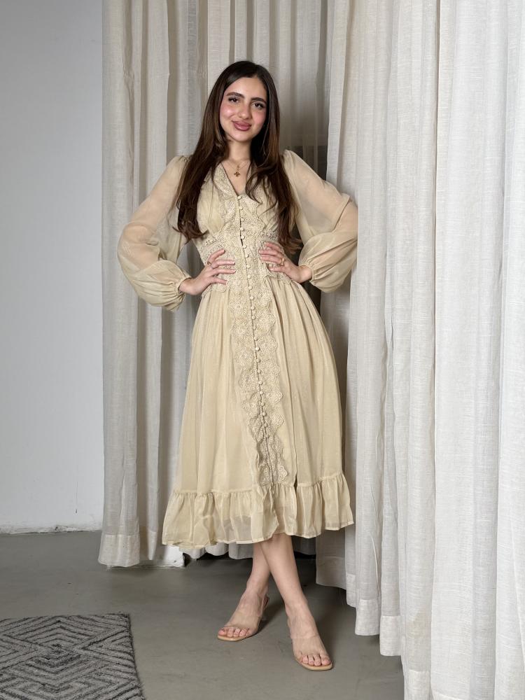 فستان ميدي بلاسيه مزين بخامة الجوبير