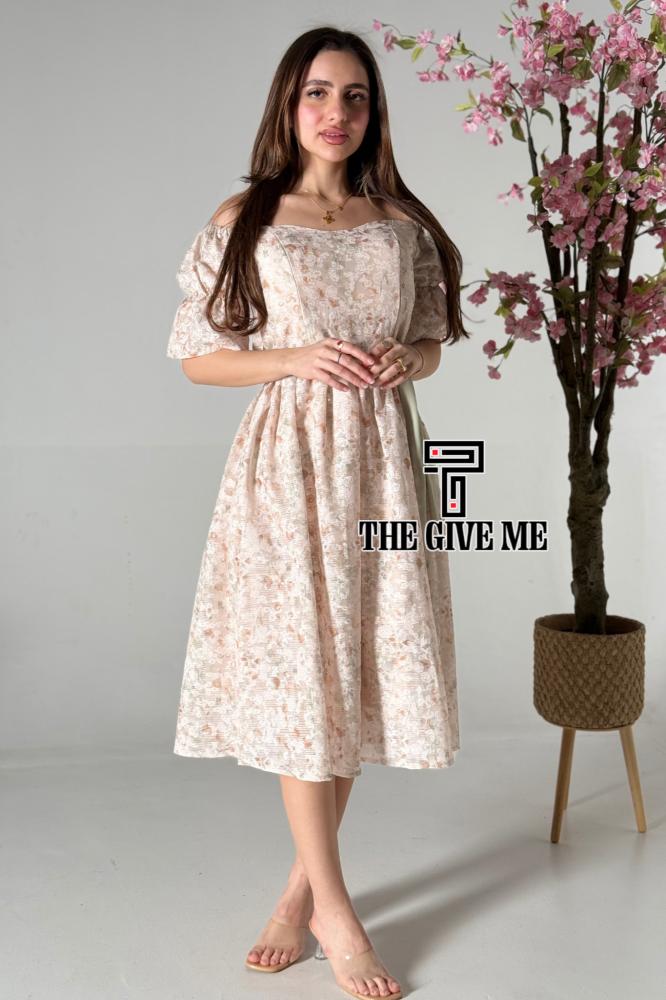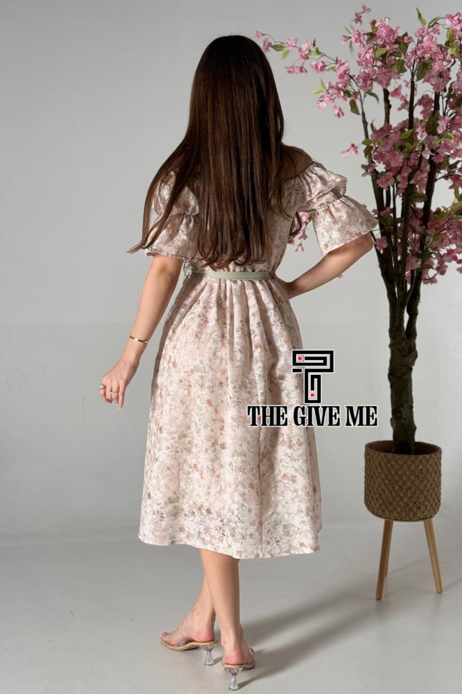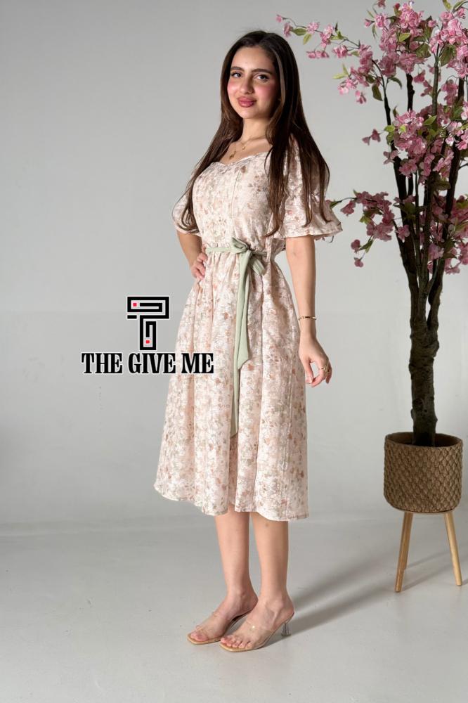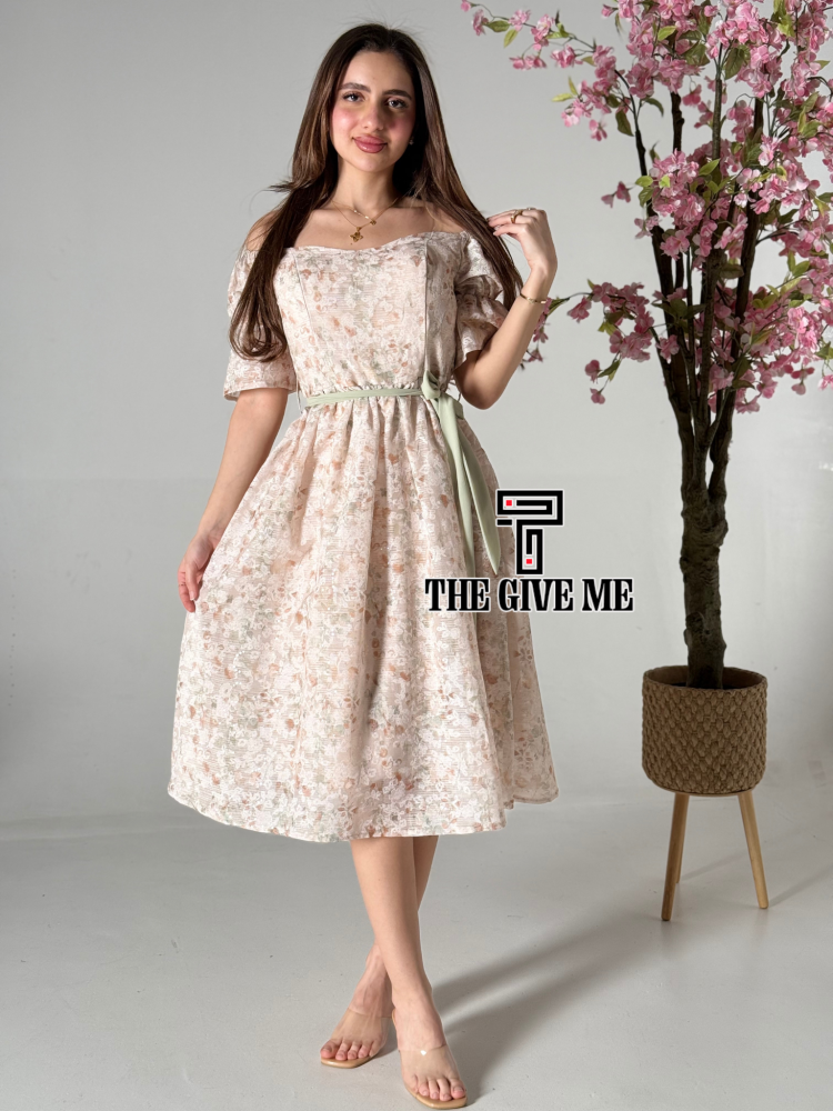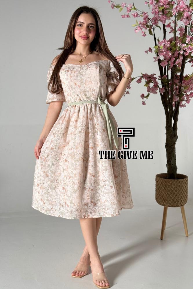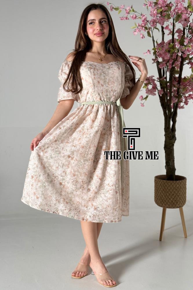 فستان ميدي كتان بطريز مشجر بالكامل بحزام على الخصر