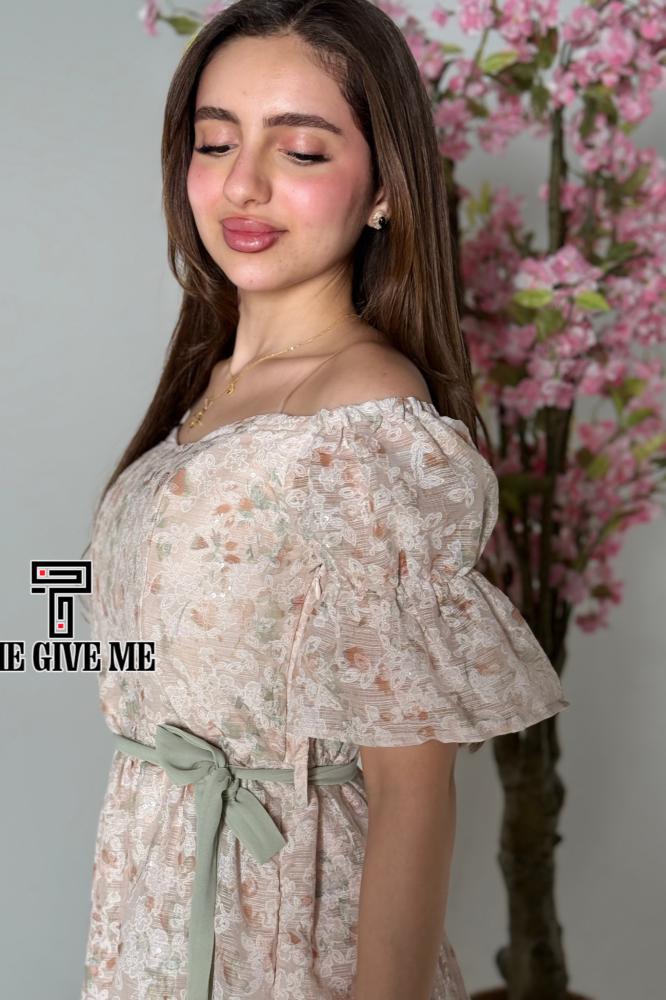 فستان ميدي كتان  بطريز مشجر بالكامل بحزام على الخصر
